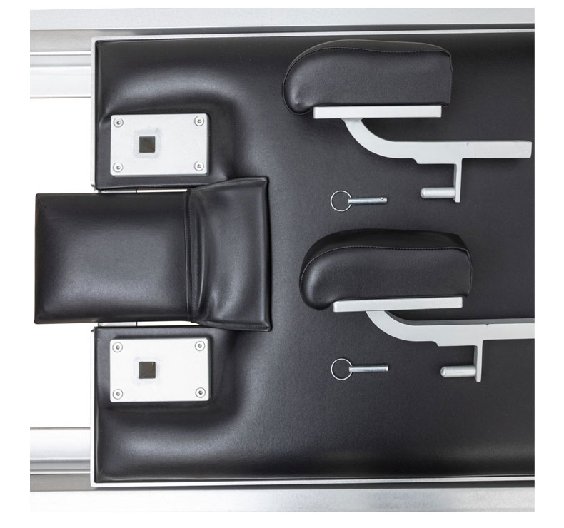 • Mecanismo de stoppers regulables para la cama tanto en el cabecero (2 posiciones) como en los pies del reformer (regulable en 3 posiciones).